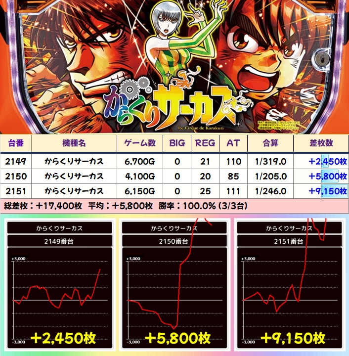この日は3台機種の「チバリヨ2」が平均+8100枚とド派手な結果になっており、2024番台は+13800枚の万枚オーバーを記録!