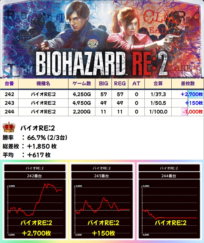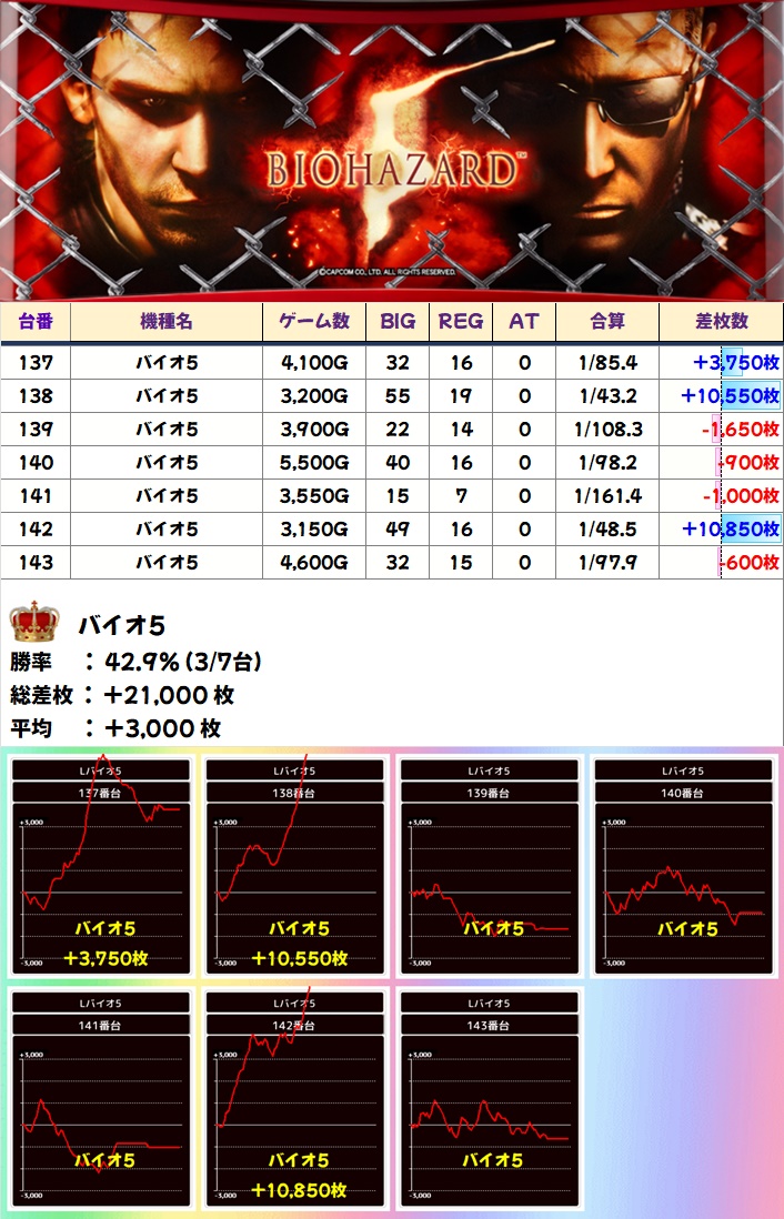 まずは【バイオ5】から!勝率こそ3/7だったものの、万枚オーバー台が2台も出現!全台打ち込みバッチリ&AT初当たりを見る限り高配分は間違いなしだった!?
