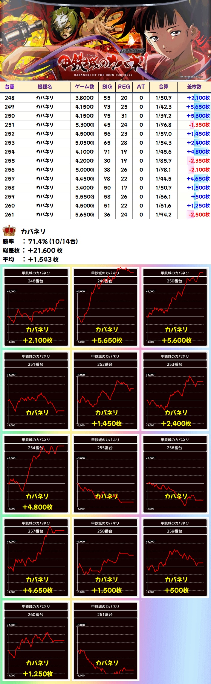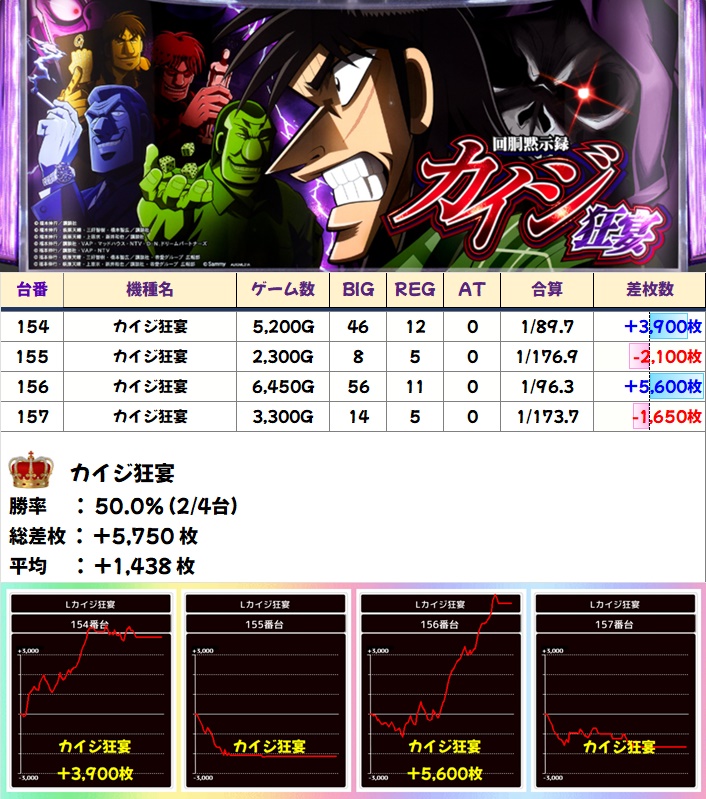 カイジ狂宴からは+5000枚オーバー、番長4からは+7000枚オーバー、からくりサーカスからは万枚オーバーと、大量獲得台が複数出現!