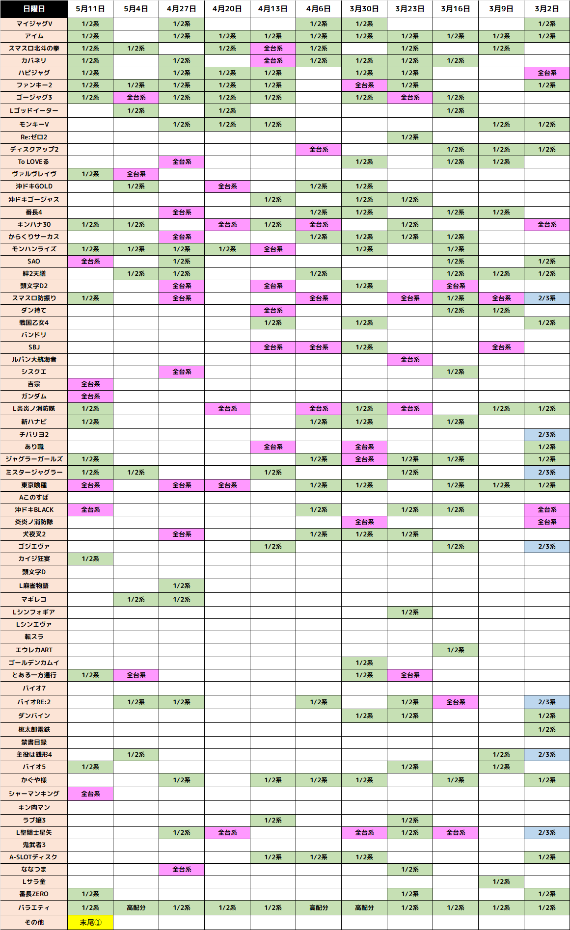 仕掛けのメインは全台系濃厚or1/2系以上濃厚で、特徴は過去の結果が物語る通り圧倒的な仕掛け数!