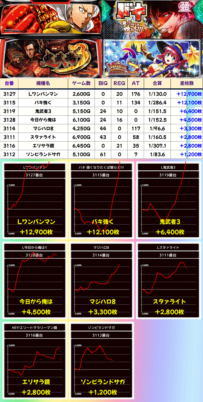 3/30✅総差枚+127,800枚/平均+386枚