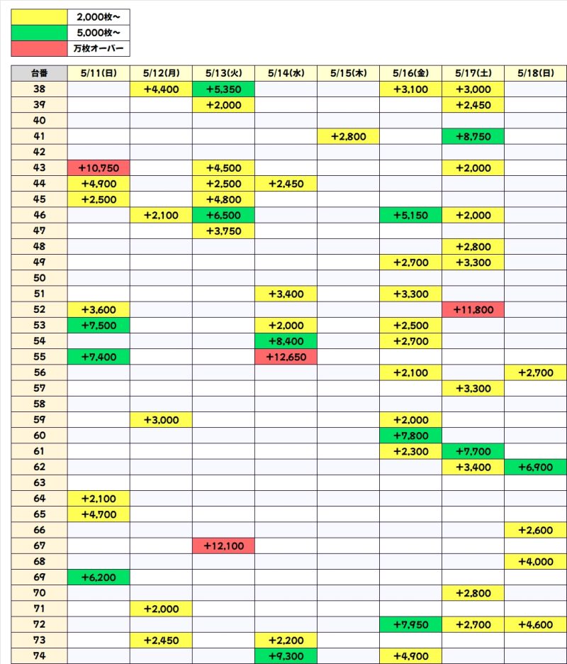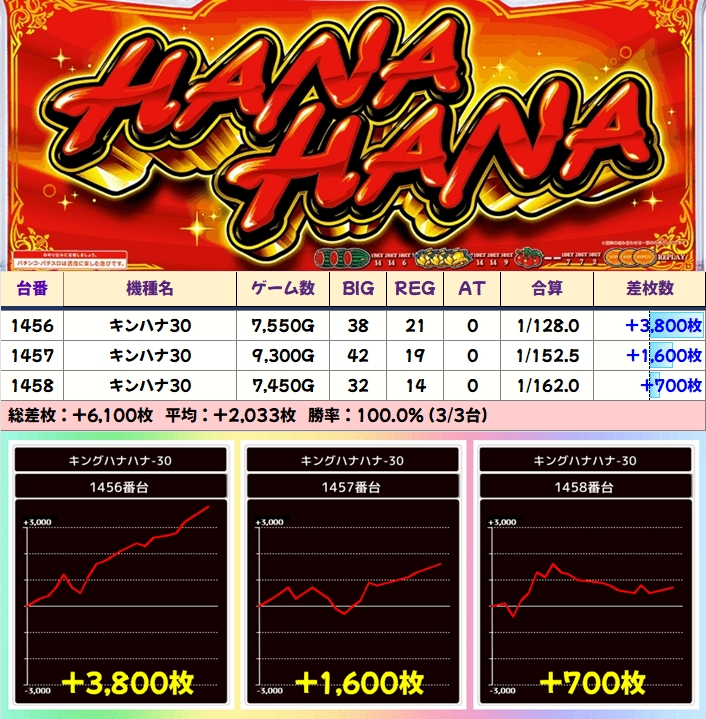 この日はかぶぱポストからヒントを確認できた3機種がいずれも全台系と思しき結果になっており、いずれの機種からも+5000枚オーバーの大量出玉が出現!