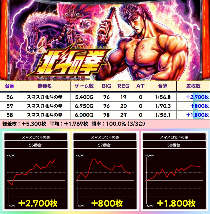 「スマスロ北斗」には3台並びの仕掛けが複数ありましたが、ここではそれらも含めて優秀台(+2000枚以上)をピックアップしていきます。
