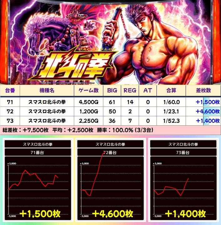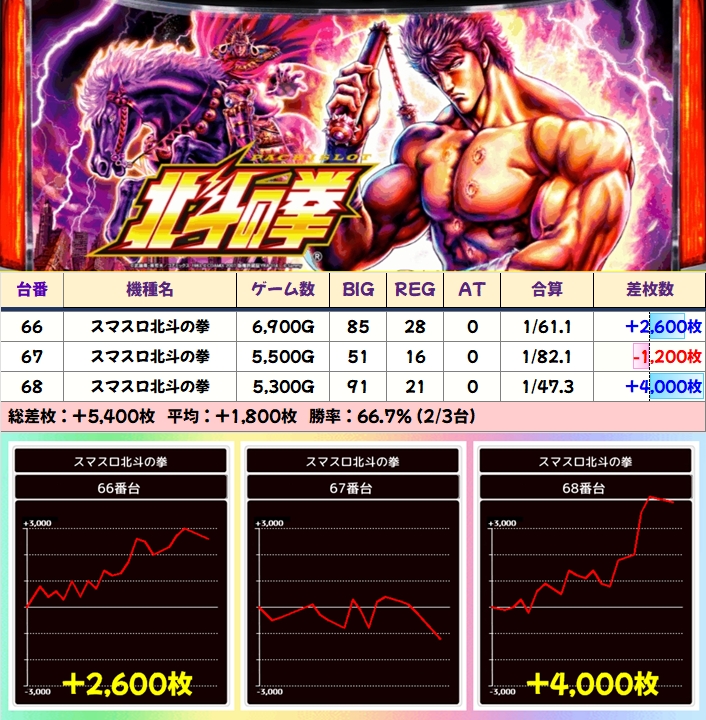 「スマスロ北斗」は+6900枚の爆出し台を筆頭に、+4000枚オーバーが2台など優秀台が複数出現!