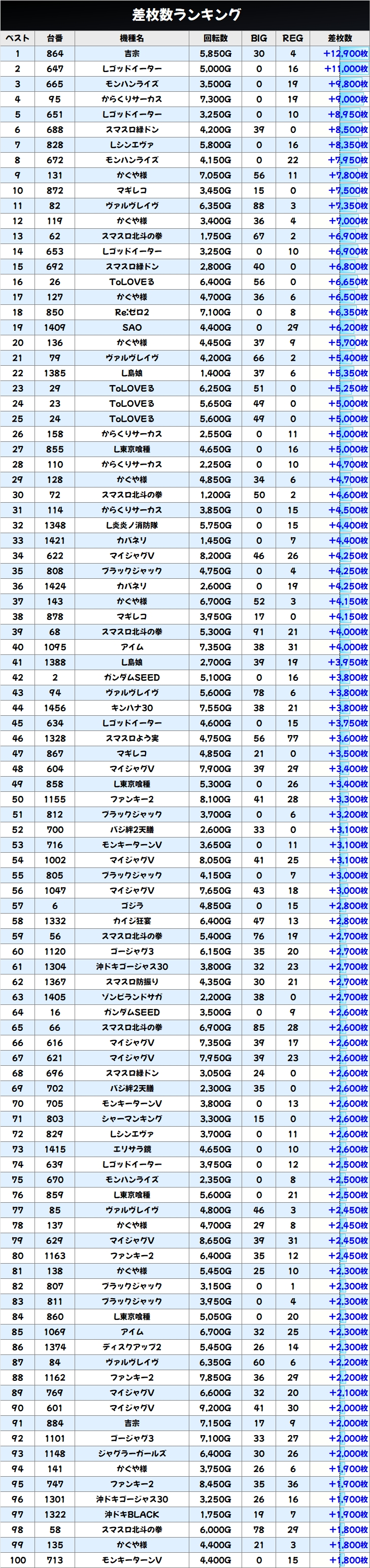 まずは各機種の優秀台のデータを見てみましょう。