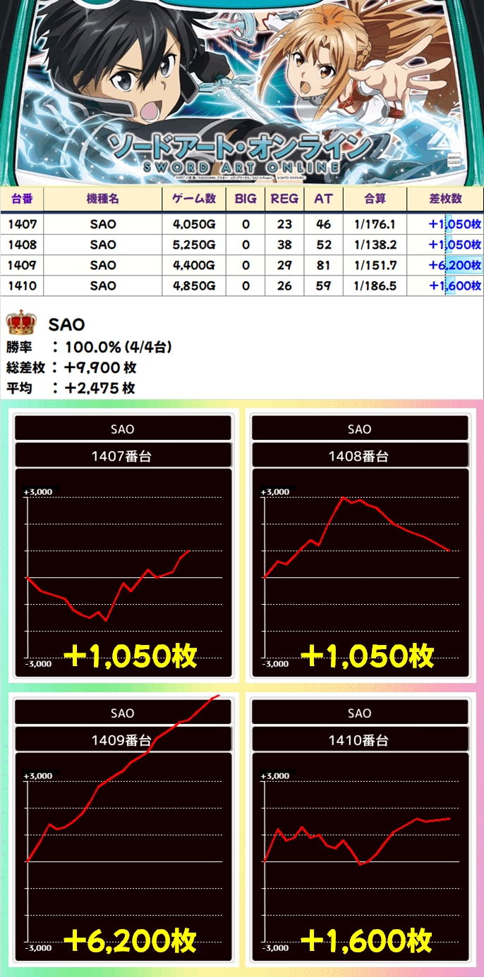 4台設置の「SAO」は全台プラスと高い安定感を見せており、4台とも夜までフル稼働していました。