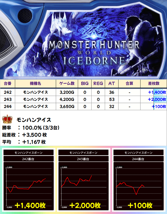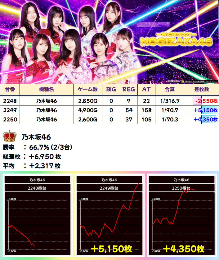 233~244番台にも機種またぎの並びがありました。「コードギアス3」は2台とも高設定らしいグラフを描きながら、平均差枚+4225枚という素晴らしい結果を叩き出しています!