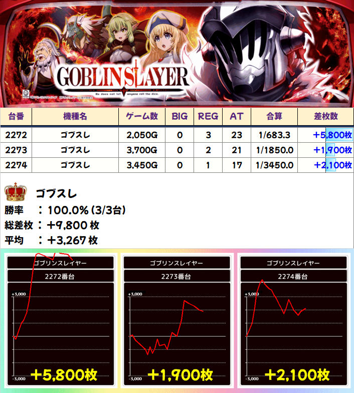 2267~2282番台の「ヴァルヴレイヴ」「ゴブスレ」「SAO」に並び仕掛けが投入! これまで「ゴブスレ」には仕掛けが投入されにくかったため回転数はあまりつきませんでしたが、3台すべてプラス、平均差枚+3267枚と爆裂機らしさ全開の出玉が飛び出しました。
