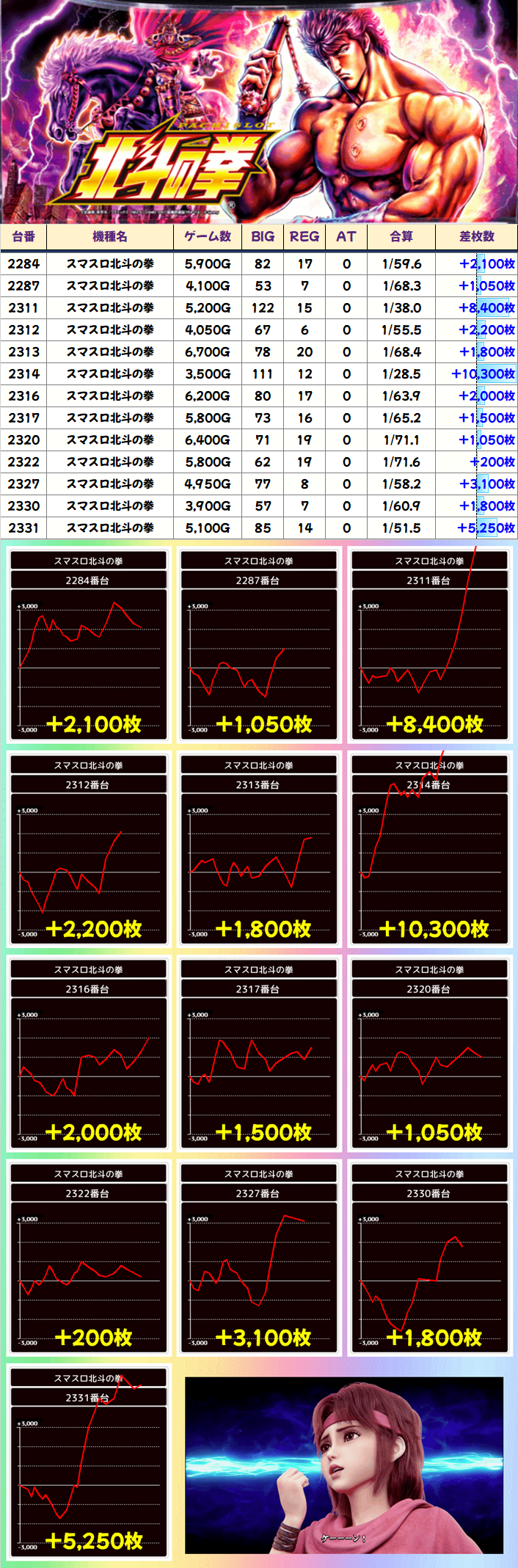 「スマスロ北斗の拳」の優秀台をピックアップ。2314番台の万枚を筆頭に+1000枚オーバーが12台も飛び出し、設定配分は高めだったのではないかと予想できますね。