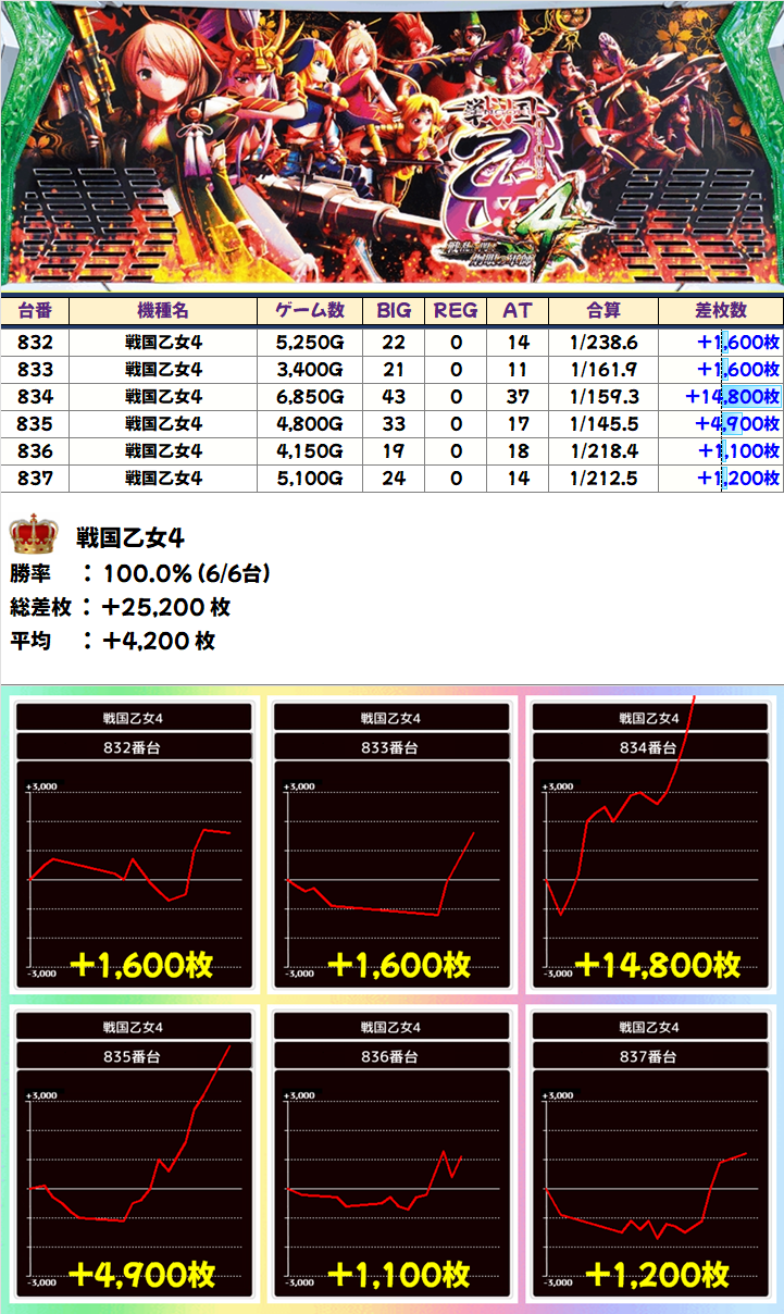 「戦国乙女4」も+14800枚を筆頭に全台+1000枚以上で平均+4200枚と「からくりサーカス」に負けず劣らずの好結果でした!