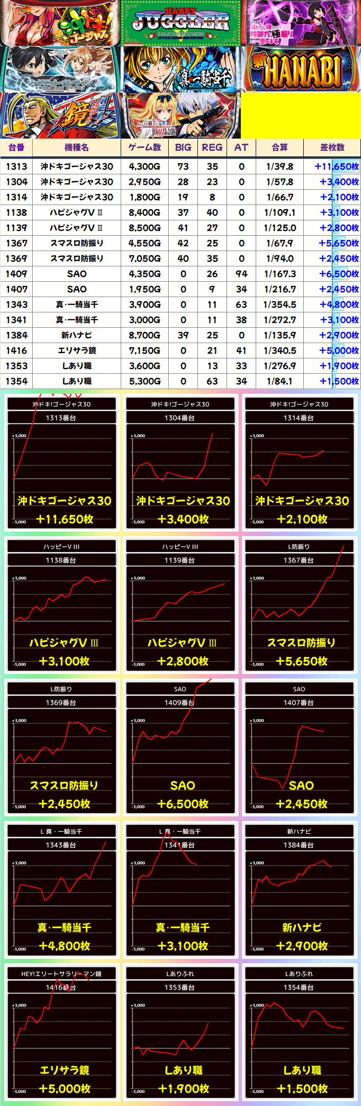 前述した通りこの3機種には抜群の仕掛けがありましたが、それらを含めて各機種の優秀台(+2000枚以上)をピックアップしていきます!