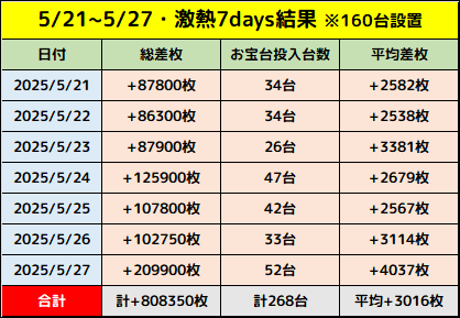 激熱7daysのトータル結果は下記の通りで、7日間で累計268台ものお宝台が出現!そしてその平均は+3016枚という好結果!