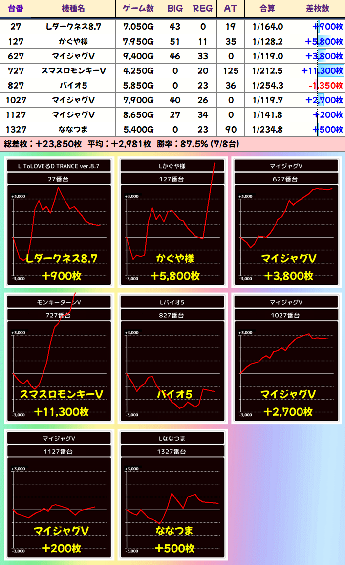 毎月21日~27日は日付け末尾の台番が強くなる傾向があり、今回の27日も日付け末尾㉗番台は、「モンキーV」の万枚など8台中7台がプラス(1427番台は稼働停止中)で平均+約3000枚と素晴らしい結果に!