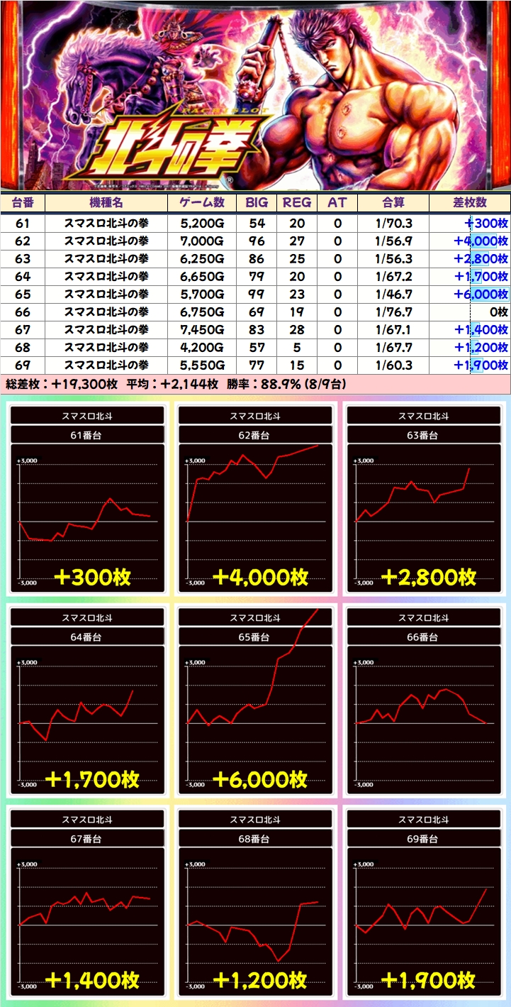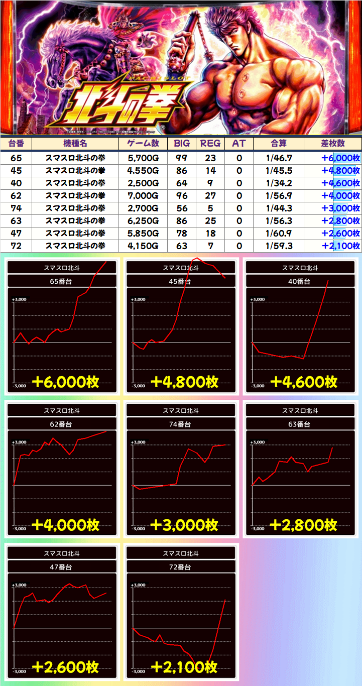 9台並びもあった「スマスロ北斗の拳」は+6000枚以上を筆頭に8台が+2000枚以上を達成!