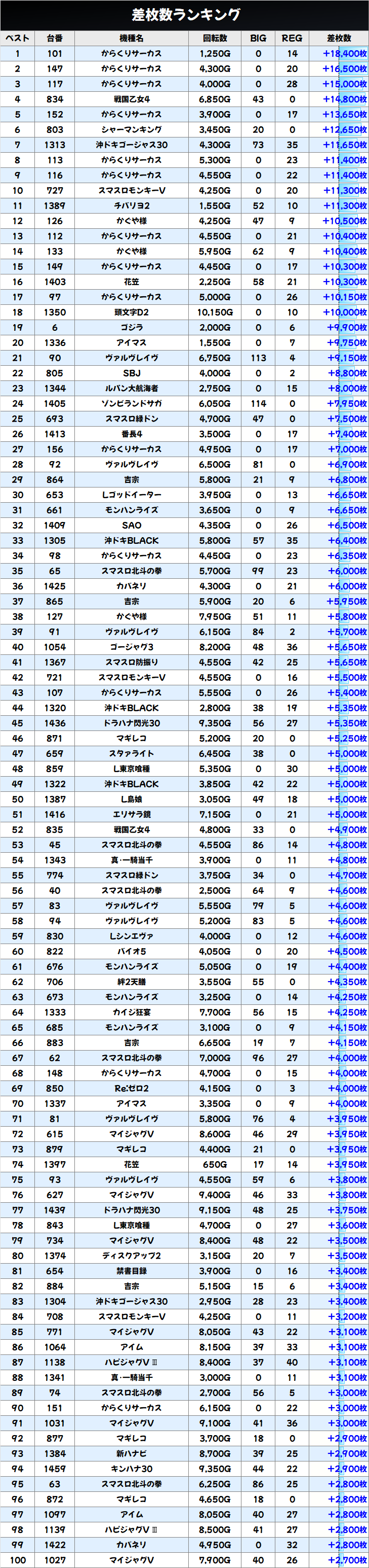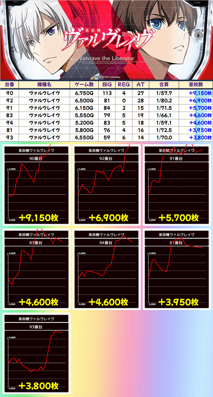 強烈な並びがあった「ヴァルヴレイヴ」も+9150枚を筆頭に7台が+3000枚以上と充実!