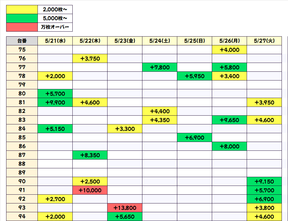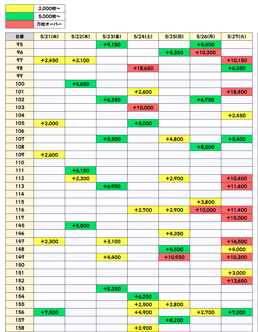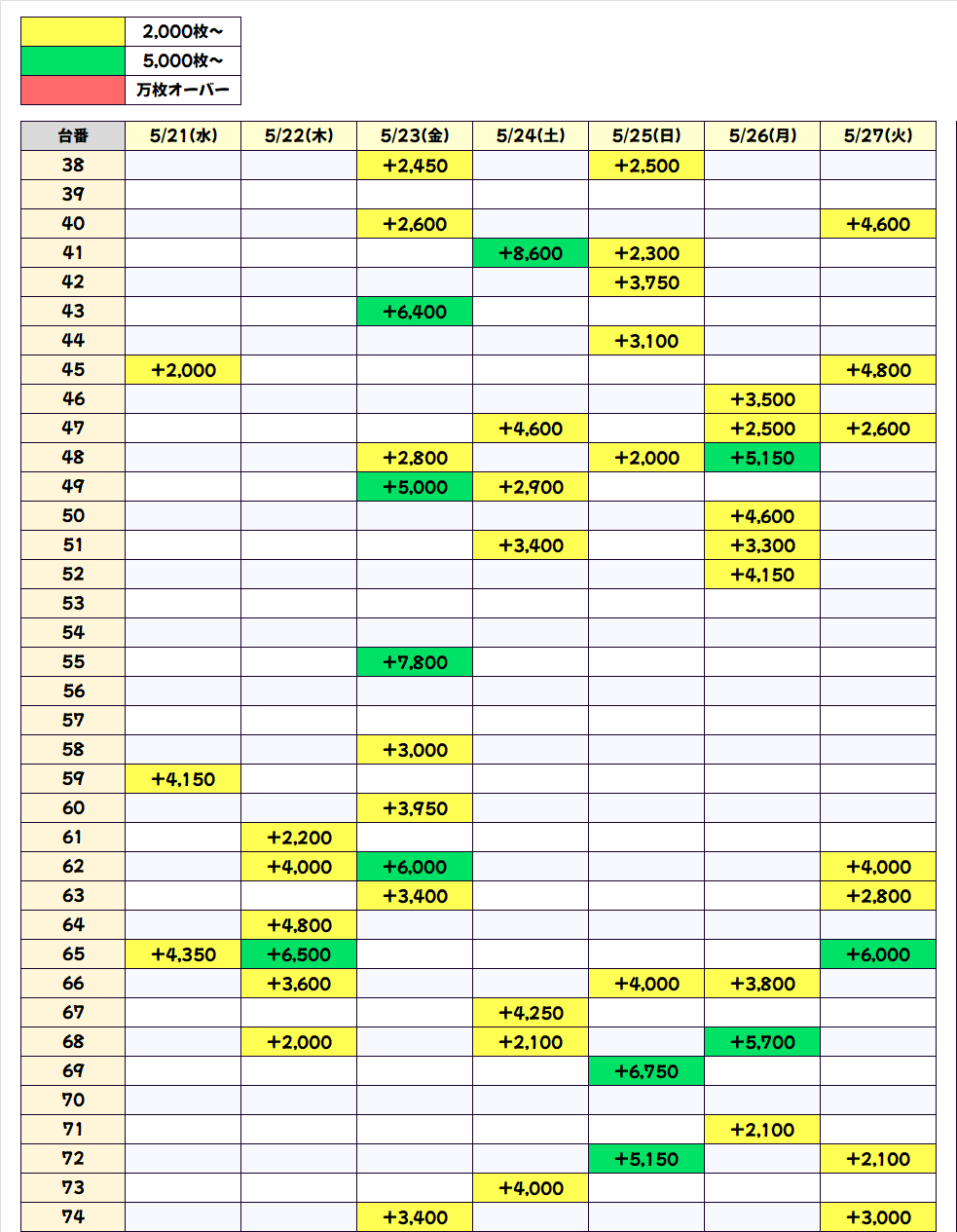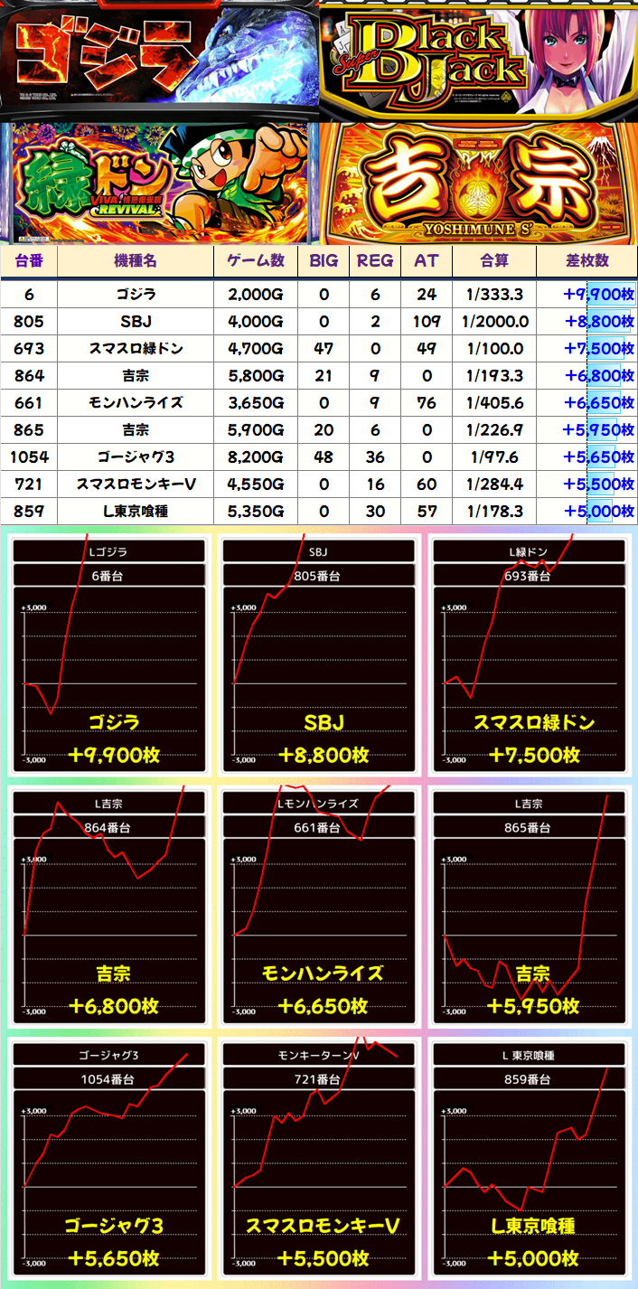 上記の仕掛け以外にも「「ゴジラ」の+9900枚、最新機種「緑ドン」&「吉宗」の+7000枚クラスなど、まだまだ+5000枚以上の優秀台が多数ありました!