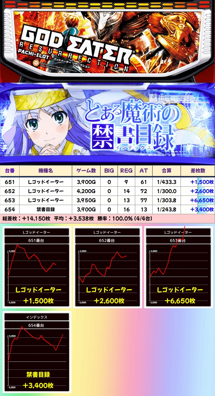 【4台並び】ゴッドイーター+禁書目録(651-654)平均+3,538枚
