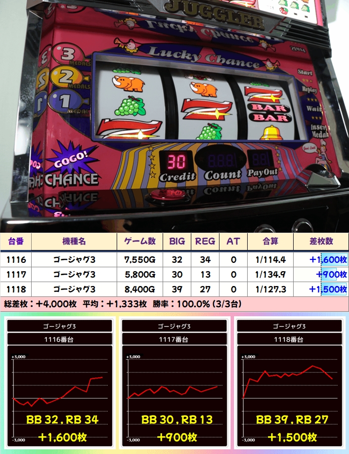 【3台並び】ゴージャグ3② (1116-1118)平均+1,333枚
