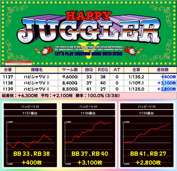 【3台並び】ハピジャグV Ⅲ (1137-1139)平均+2,100枚