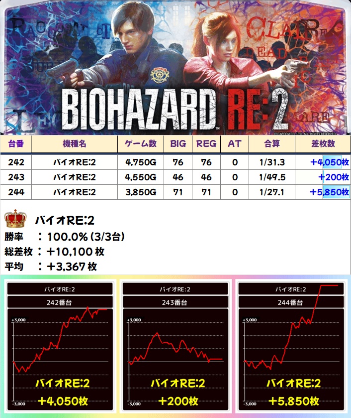 続いては【バイオRE2】!こちらは全台プラスなうえに3台中2台が+4000枚以上と好結果に!こちらも全台系候補でしたね