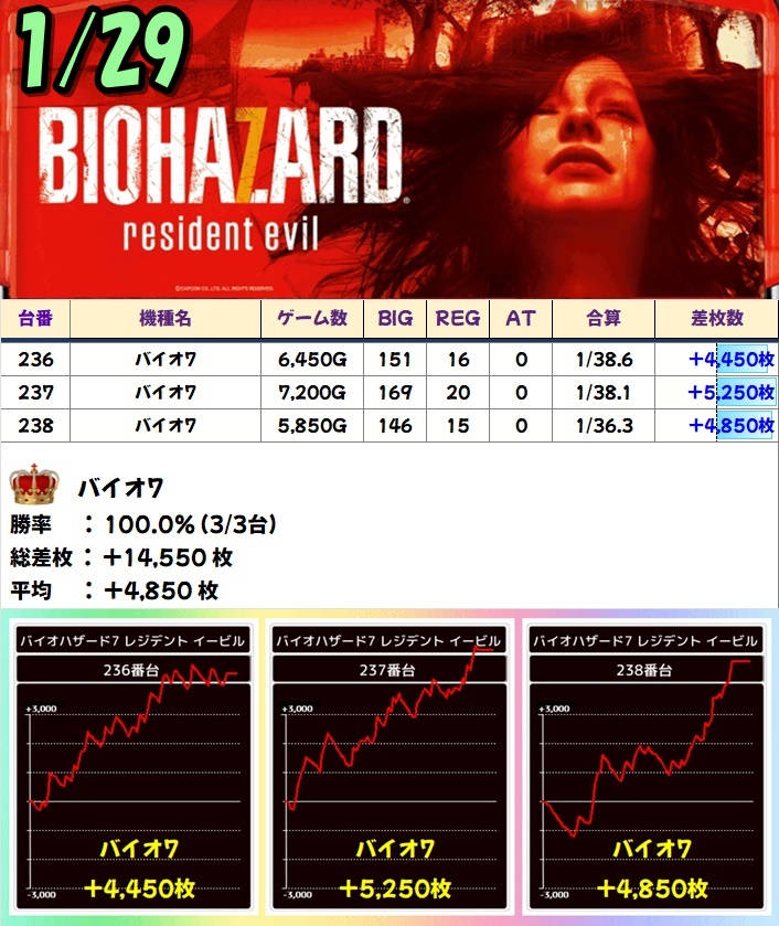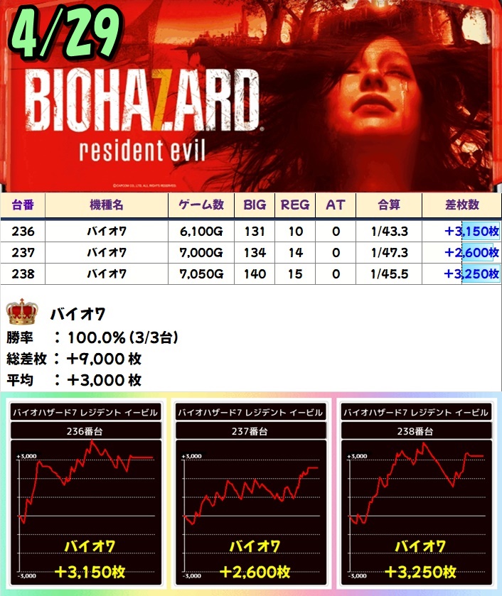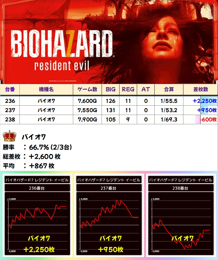 【バイオ7】は残念ながら1台だけマイナスとなってしまいましたが、打ち込みバッチリ&AT初当たりを見る限りでは全台系候補で間違いなし!?