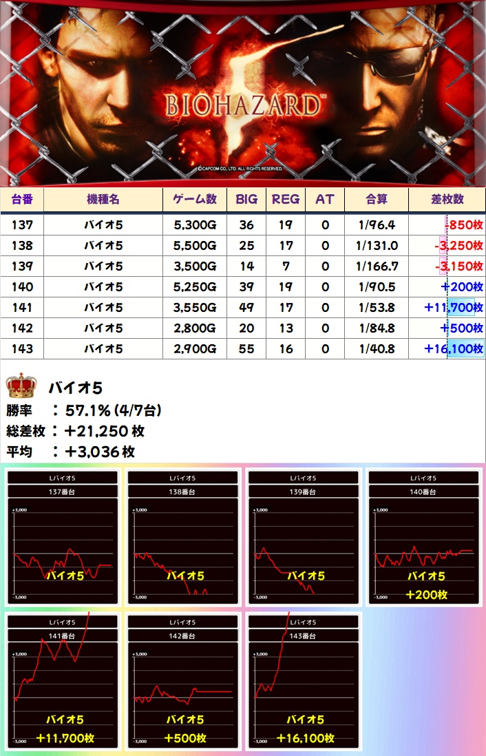 今回もバイオシリーズからの仕掛けアリ!全機種が全台系挙動だったと思わせる好結果に!バイオ5からは万枚オーバーが2台も飛び出し、かなり盛り上がっていましたね!