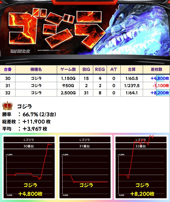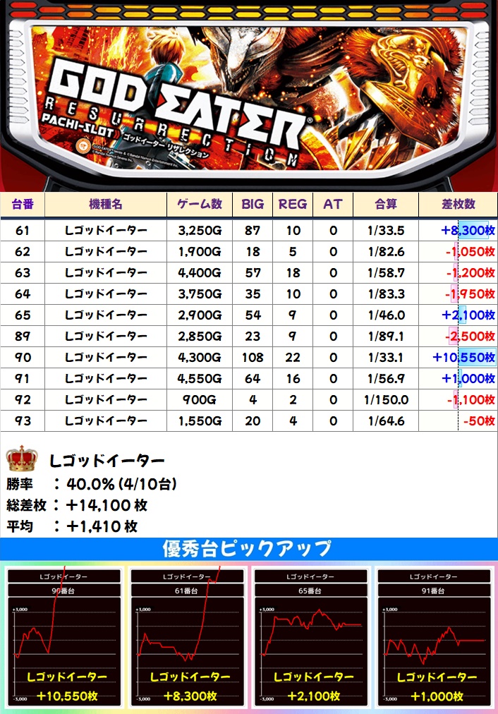 もちろんその他の高配分機種も!【Lゴッドイーター】【スマスロモンキーV】の山佐コンビ&【ゴジラ】は優秀台を多数確認できました!