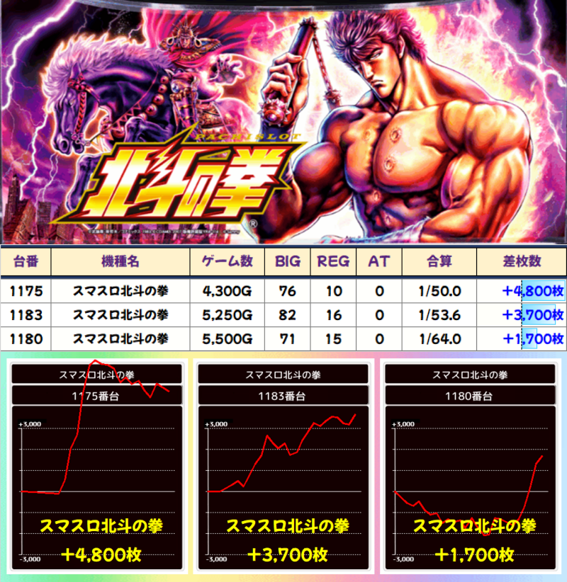 最近増台をした「スマスロ北斗の拳」に注目してみました。+4800枚の1175番台を筆頭に、半数近くがプラス差枚で、総差枚でもプラスという結果でした。毎回特定日には、他の機種に比べ高配分の傾向が強い「スマスロ北斗の拳」。狙う価値はあるのではないでしょうか。