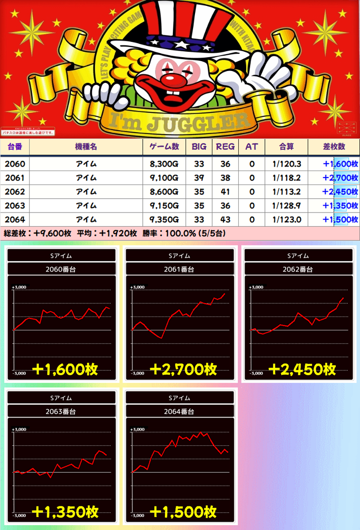 5の日ということでジャグに優秀台が大量にあり、ジャグだけで6万枚超のプラス!勝率も約6割と1/2以上あり、全てのジャグラーシリーズが平均プラスとなりました!