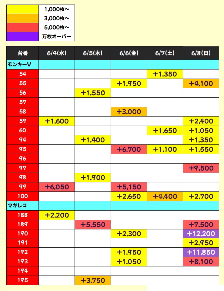 推すすめ5日目となった【マギレコ】【スマスロモンキーV】でしたが、こちらは両機種ともに優秀台が多数出現!特にマギレコは万枚オーバー2台&+7000枚オーバーも2台と、かなりの出玉を見せつけてくれました!推すすめ×⑧の日が重なった時は、コチラも超狙い目です!