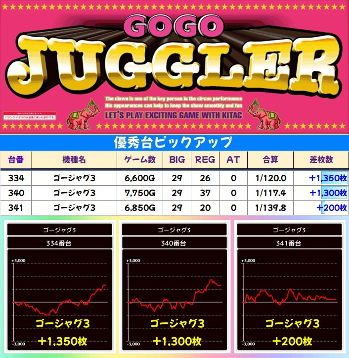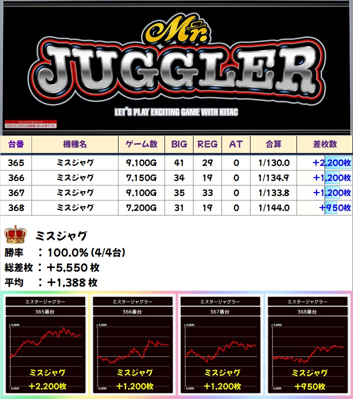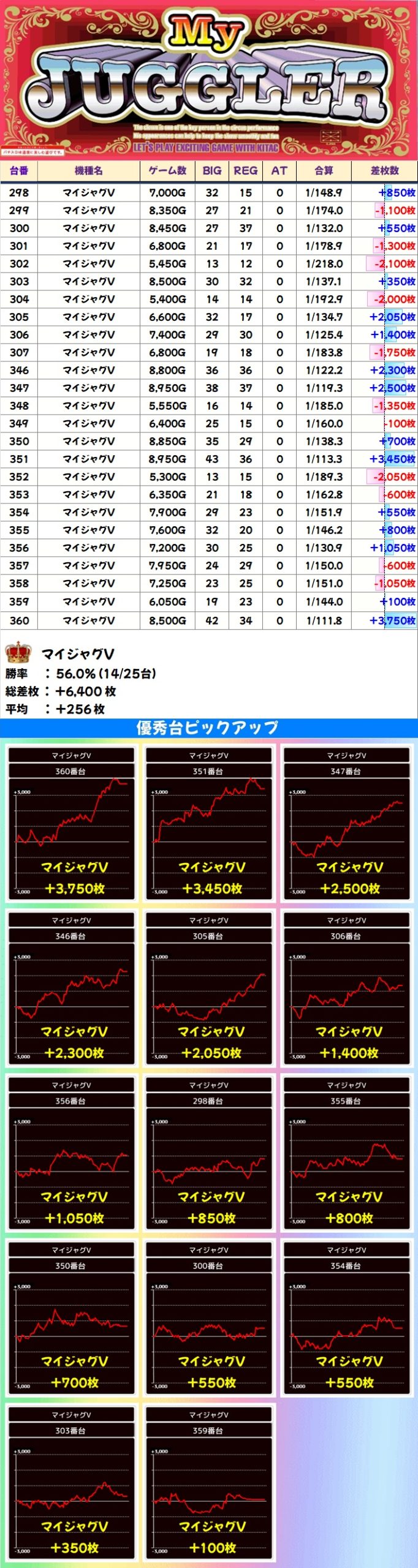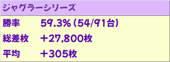 ジャグは全体で総差枚+2.7万枚&平均+305枚と、今回も好結果に!やはり若葉まいたけさん=ジャグ系は絶対ですね!
