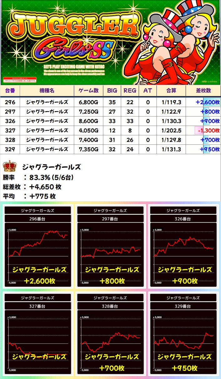 🌈ジャグラーガールズ(6台)【平均+775枚】