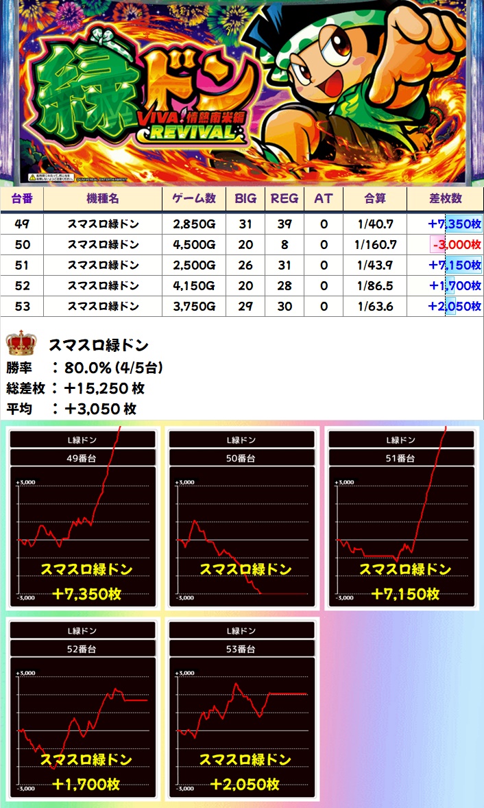 まずは【スマスロ緑ドン】から!+7000枚オーバーが2台も出現してかなりの好結果に!1台だけマイナスとなってしまいましたが、こちらは全台系候補で間違いなし!