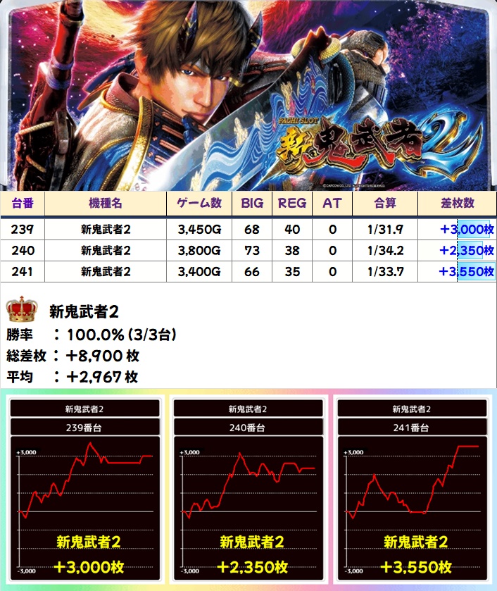 そして【新鬼武者2】【スマスロ防振り】【マジハロ8】も全台系候補で間違いナシでしょう!どの機種も平均出玉が+2000枚を超える好結果に!