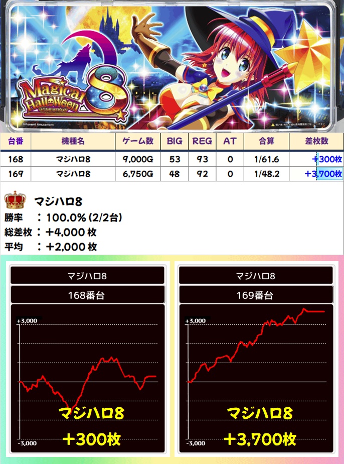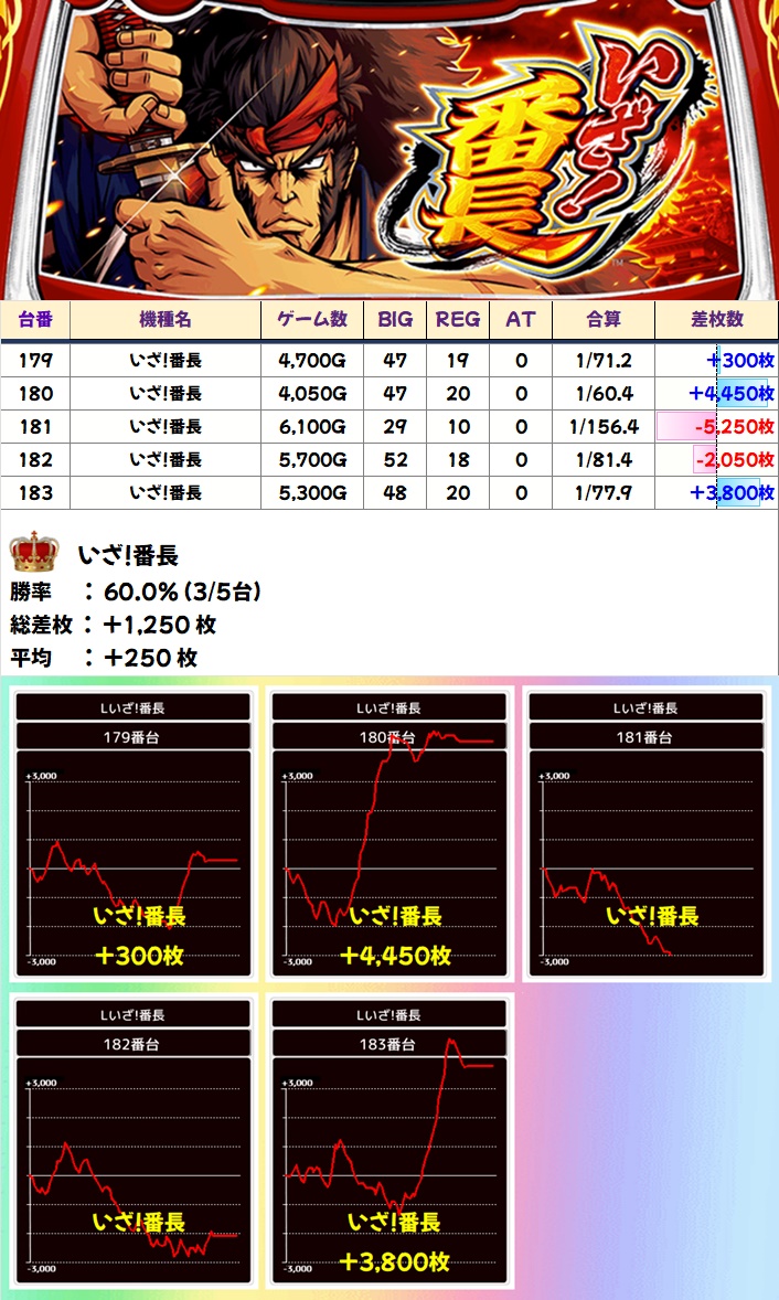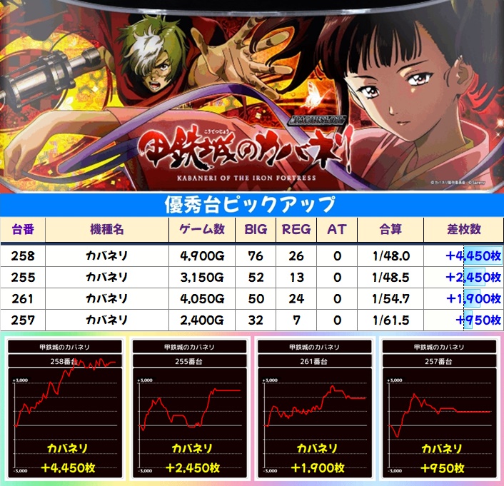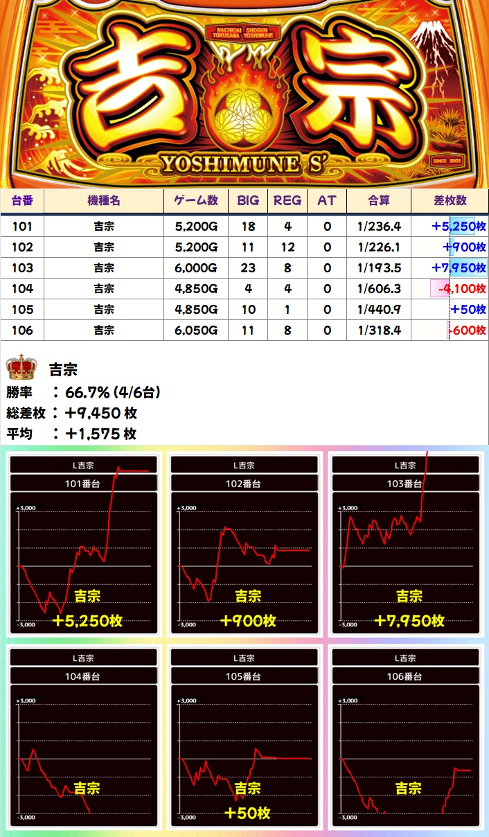 そして大都コンビの【いざ!番長】【吉宗】からも勝率ニブイチ超え&大量獲得台が多数アリ!最新台もしっかりと仕掛け候補となってましたね!