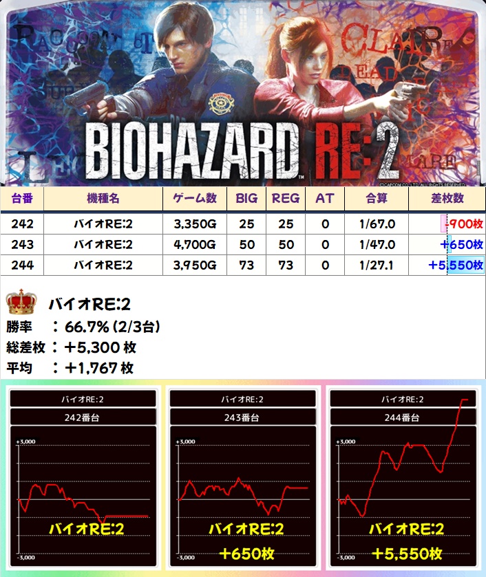 そして仕掛け常連機種の【バイオRE2】【このすば】やアクロス系の【クランキークレスト】【新ハナビ】も高配分機種っぽい高挙動に!