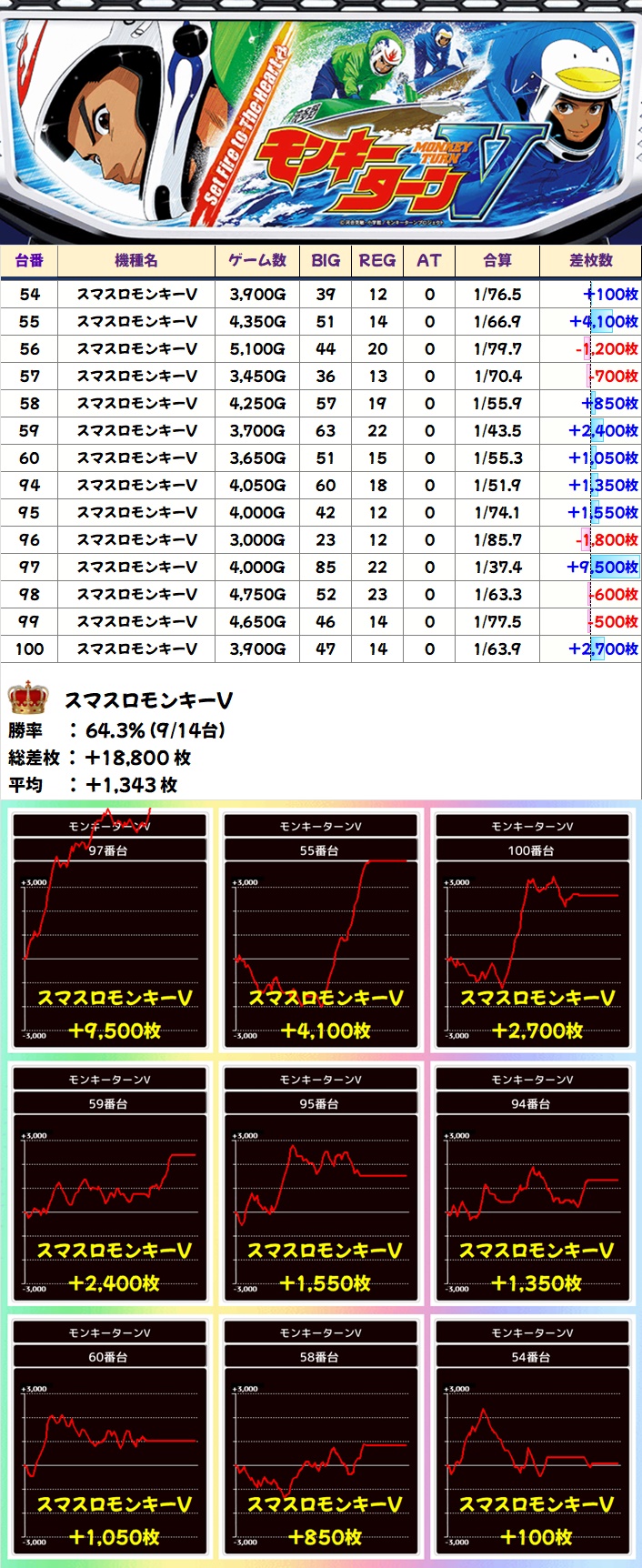 🌈スマスロモンキーV(14台)【平均+1343枚】