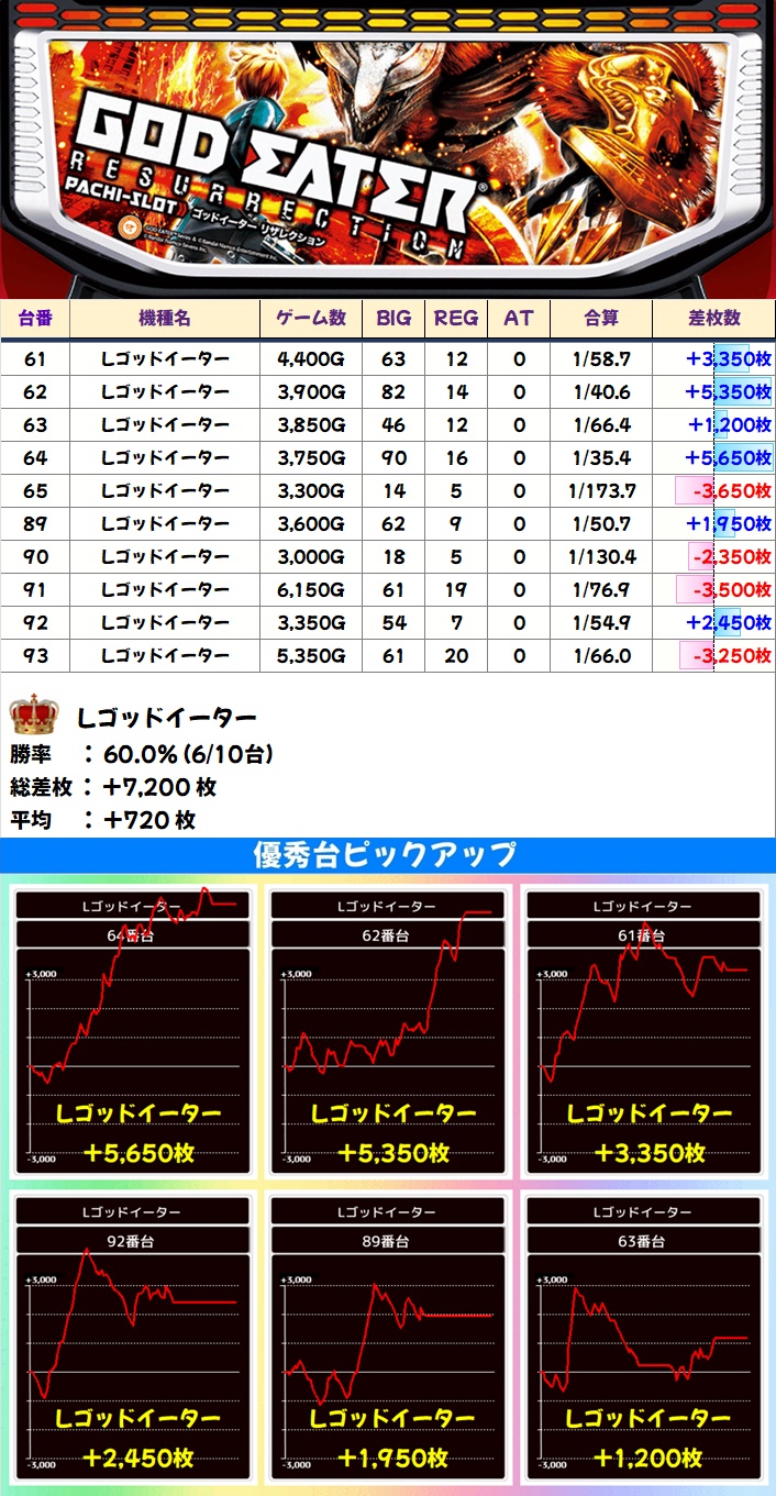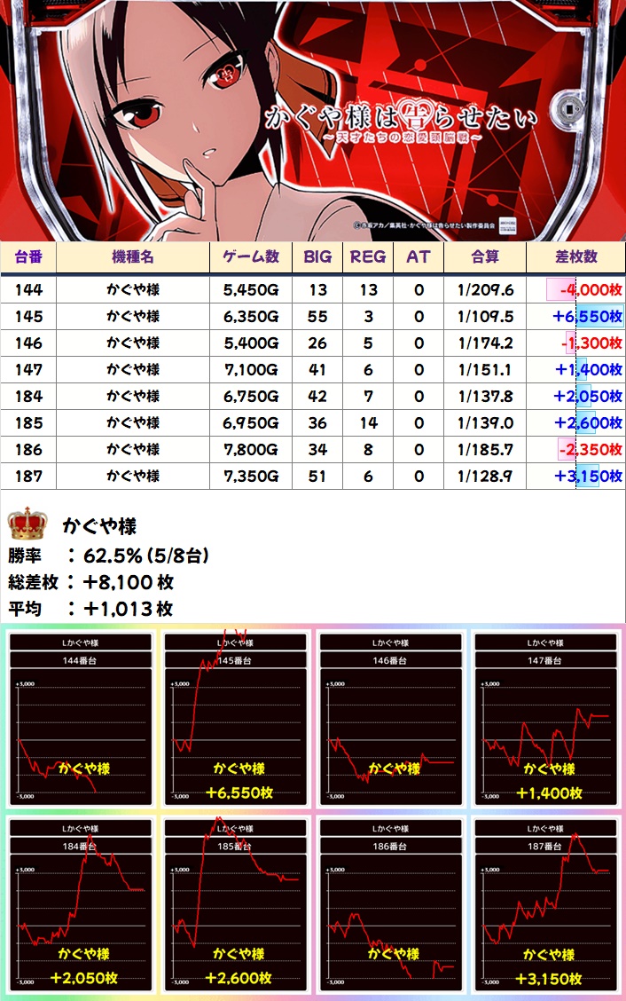 人気機種の【かぐや様】【Lゴッドイーター】【L東京喰種】からは、どれも勝率がニブイチを超える好結果に!L東京喰種からはしっかりと万枚オーバー台があり、残り2機種からも大量獲得台が複数確認できました!