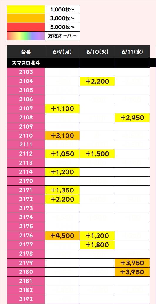 6月11日(水)|エスパス高田馬場|ゾロ目日特有の大量並び仕掛けは今回も確認!多くの並びが平均2000枚超のプラス!おなじみの全台系濃厚や高配分以上の機種も多数あり!