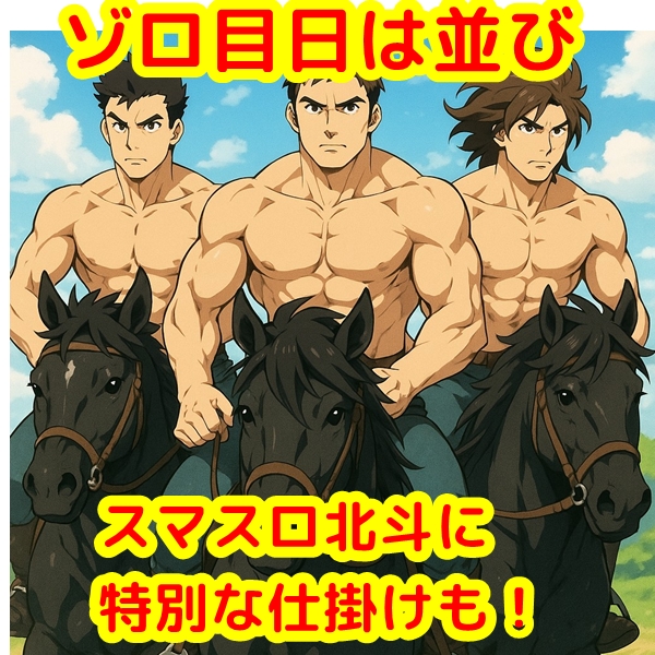またこの日は北斗の背景が紫のラオウに変化していたので、特日と合わさるときの北斗は微妙な変化にも注目です!今回は紫で列全らしき箇所が登場したので、次回も紫になった際は列全を意識しておきましょう。ちなみに、毎日ポスター登場からの過去結果は下記をチェック!