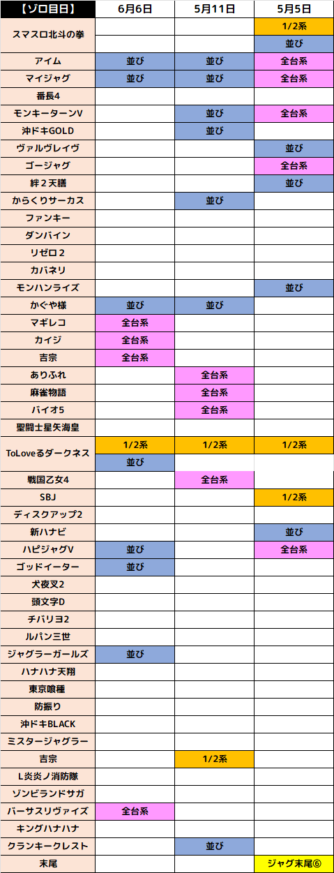 ゾロ目の日の目玉仕掛けでもある並び。今回も6カ所あり、稼働不足台もあるのでもしかしたら埋もれてしまった並びがあった可能性も!過去には20カ所以上の並びが投入されたこともあったので、好調台を見つけたらまずはサイドから攻めるべし!