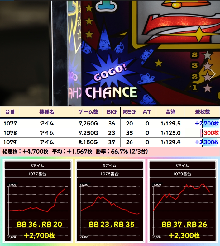 なお、この日はアイムが好調だったようで、全体でも台平均+274枚としっかりプラス差枚になっていましたよ!