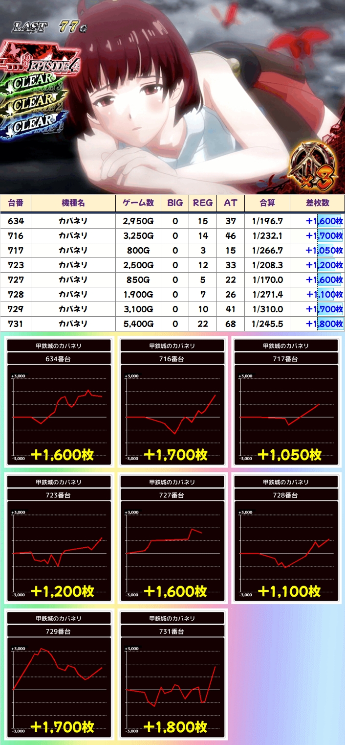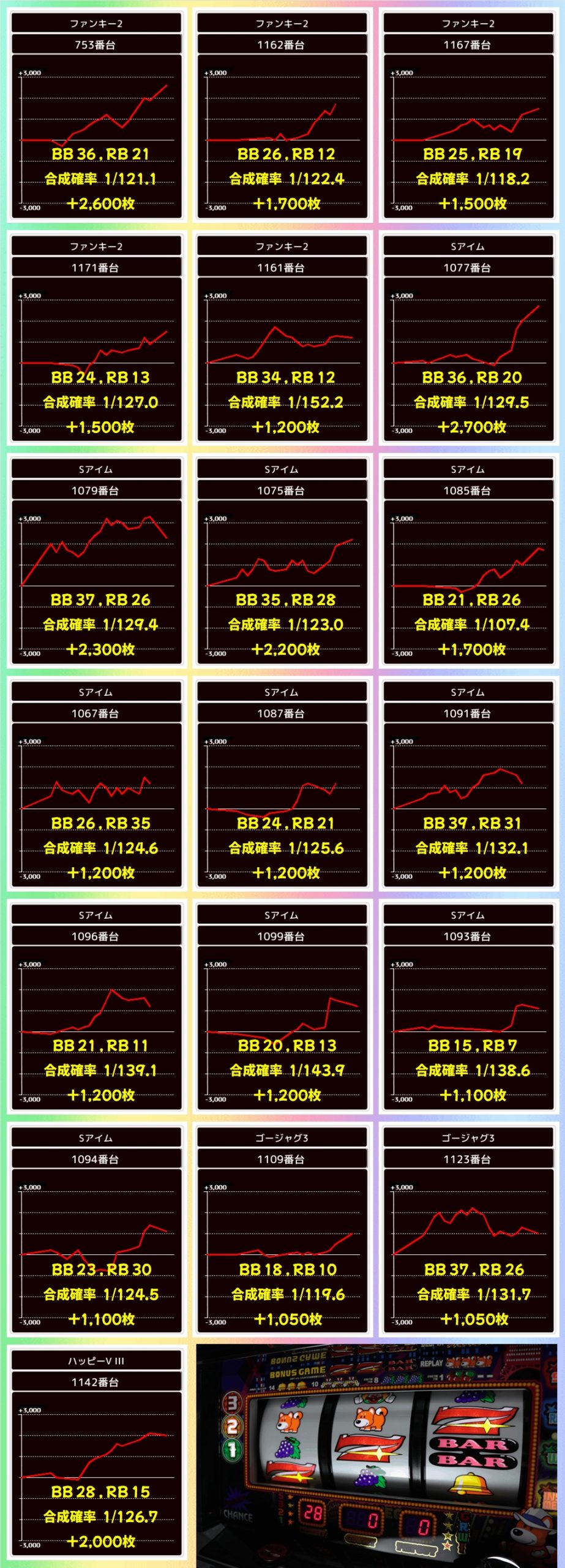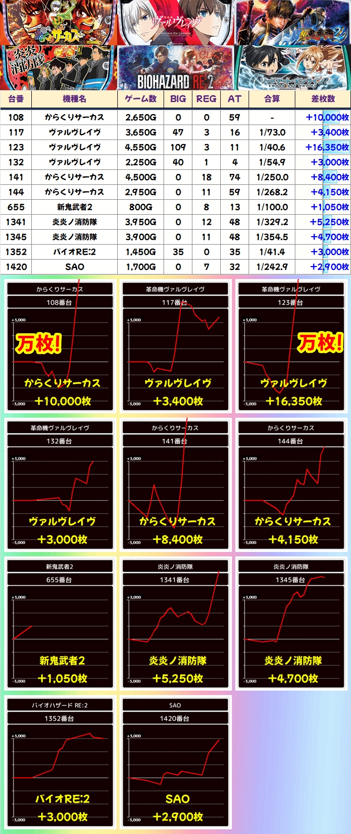 この日はヴァルヴレイヴとからくりサーカスから万枚オーバー台が出現しており、その他の機種からも+3000枚以上の台を複数確認することができました!