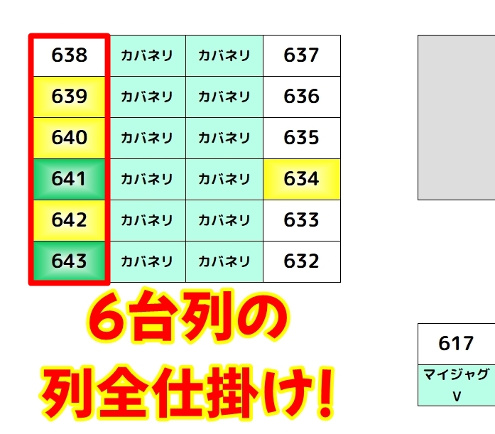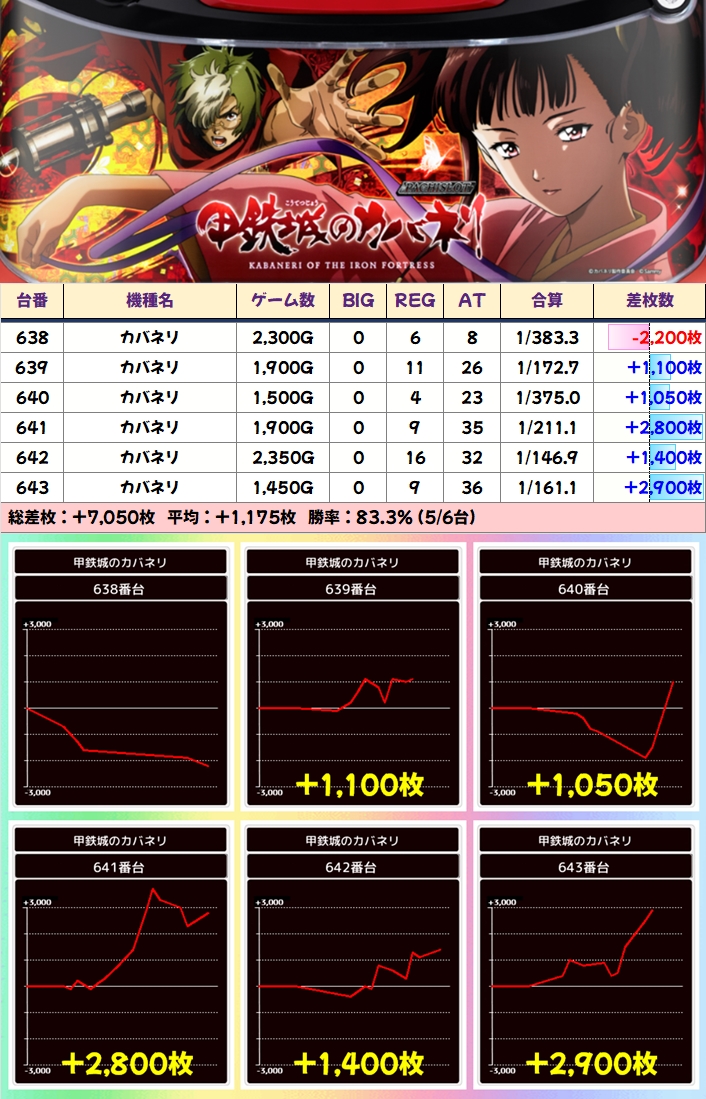惜しくも638番台は不発に終わっていますが、残りの5台は綺麗にプラス差枚となっていました。
