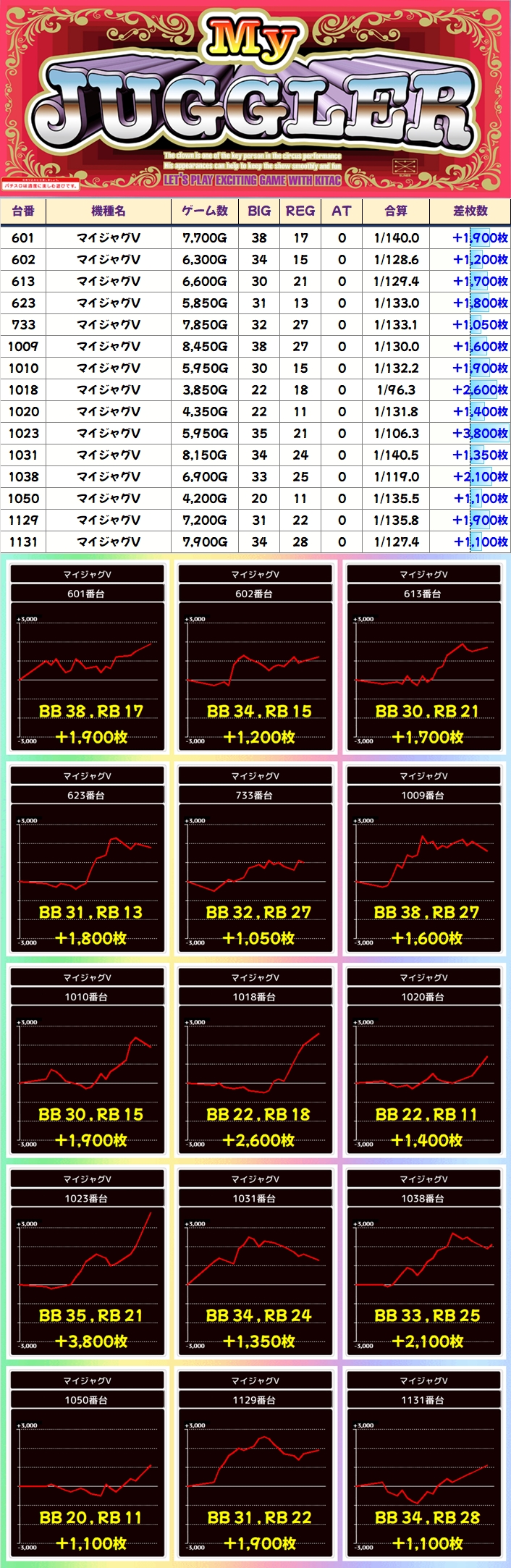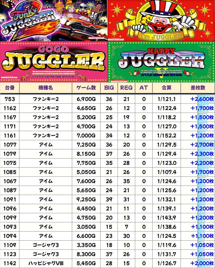 その他ジャグラー:+1000枚以上(19台)