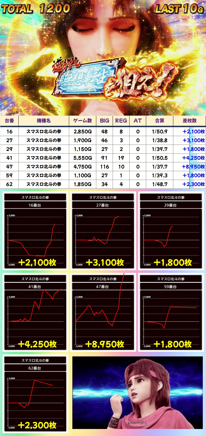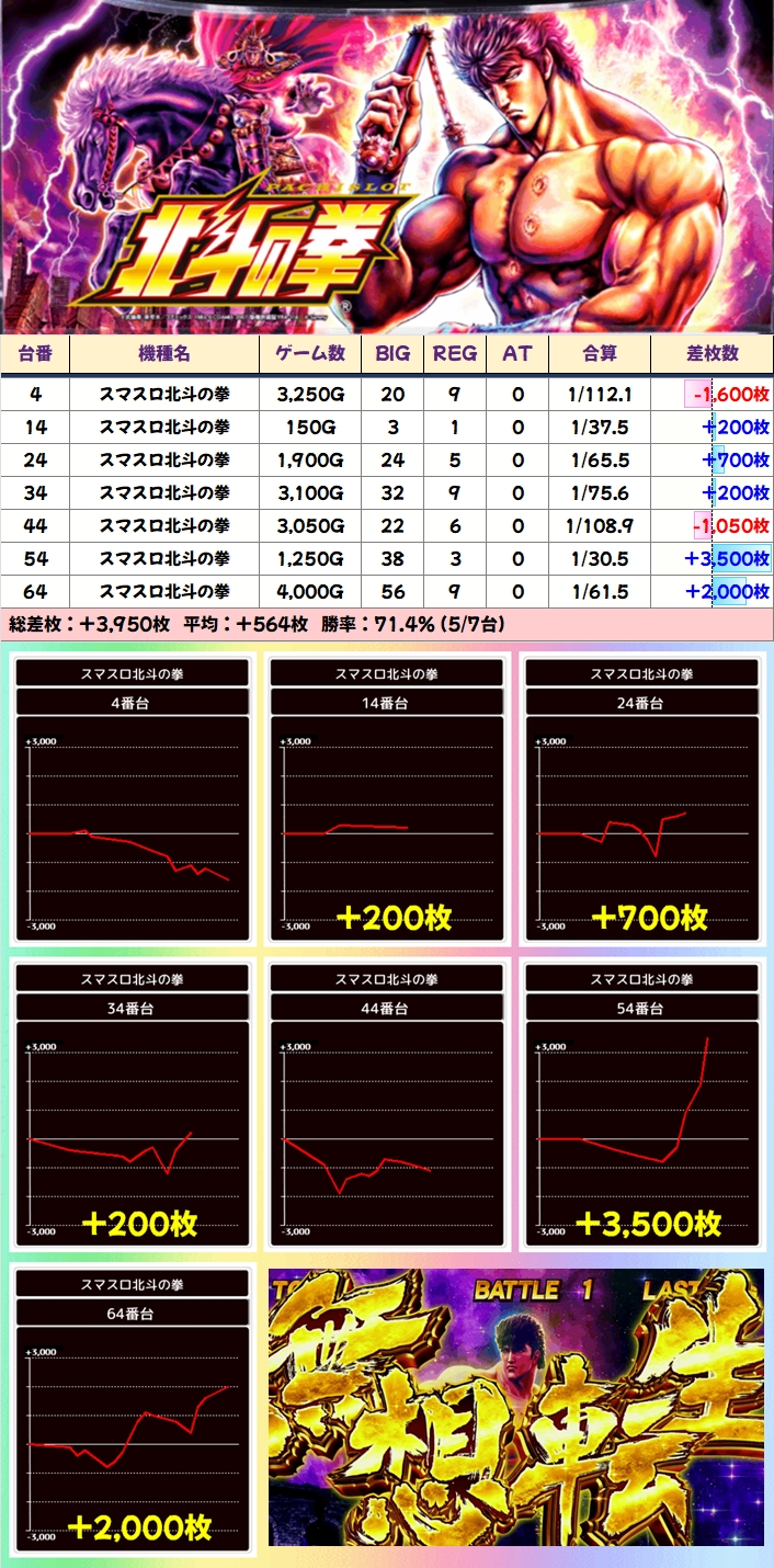 この日はスマスロ北斗に末尾仕掛けが用意されており、勝率71.4%(5/7台)・台平均+564枚とまずまずな結果になっていました。