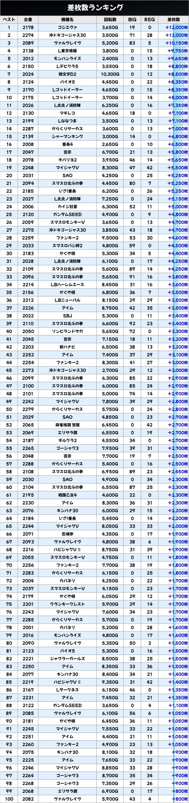 ポストに絡んでいた機種は他の機種よりも優秀になることが多く、今回も吉宗やモンハンからは万枚クラスや+5000枚超台あり!