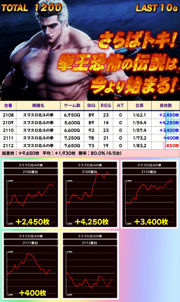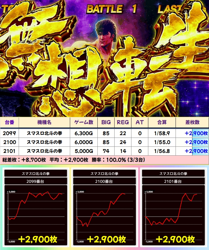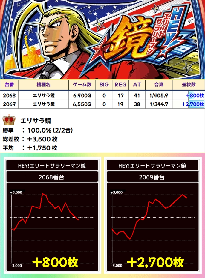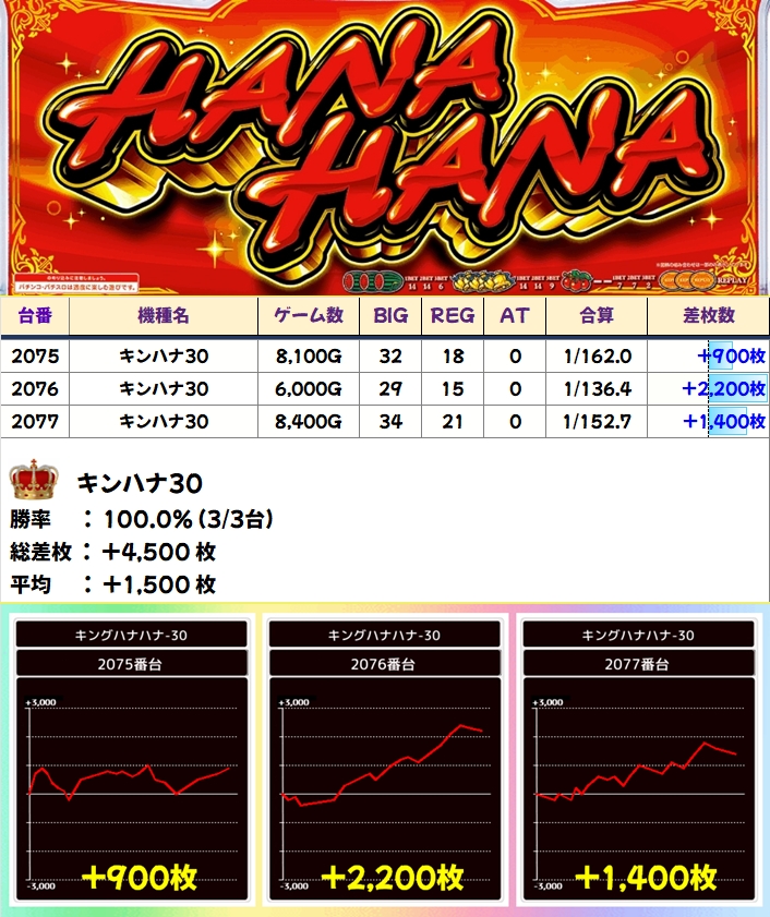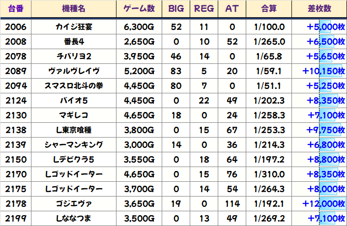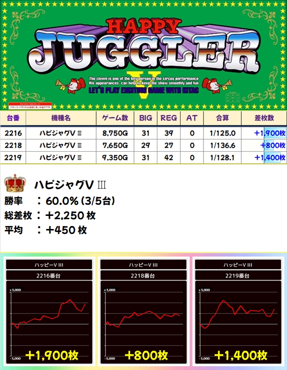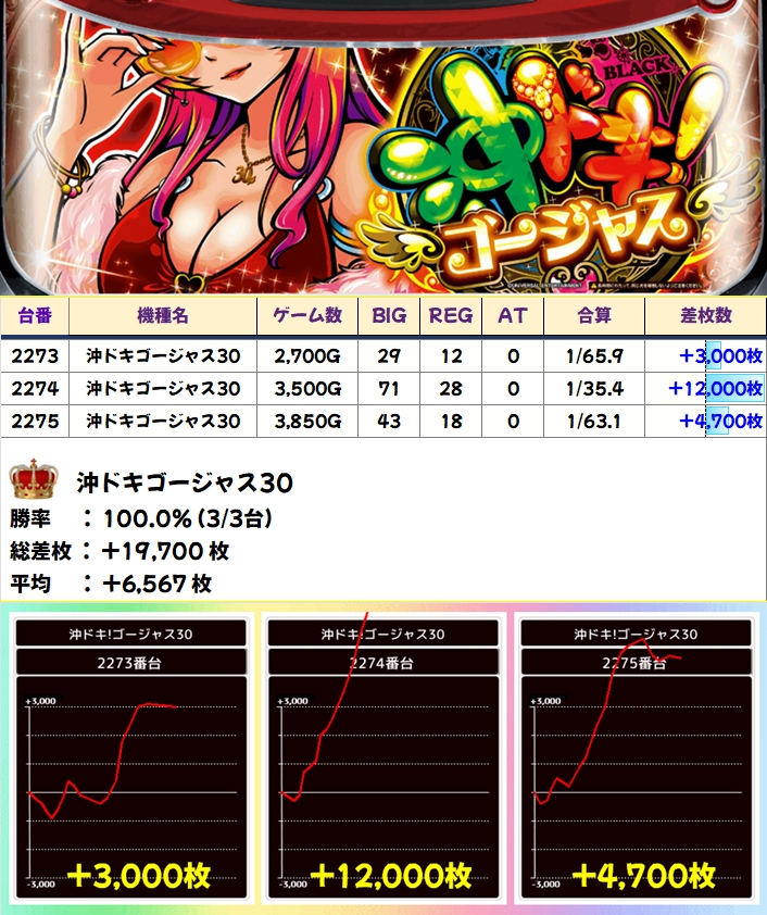 今回は万枚超3台、60台以上が2000枚超を獲得しました。全体の総差枚も約+7万枚の優秀成績!