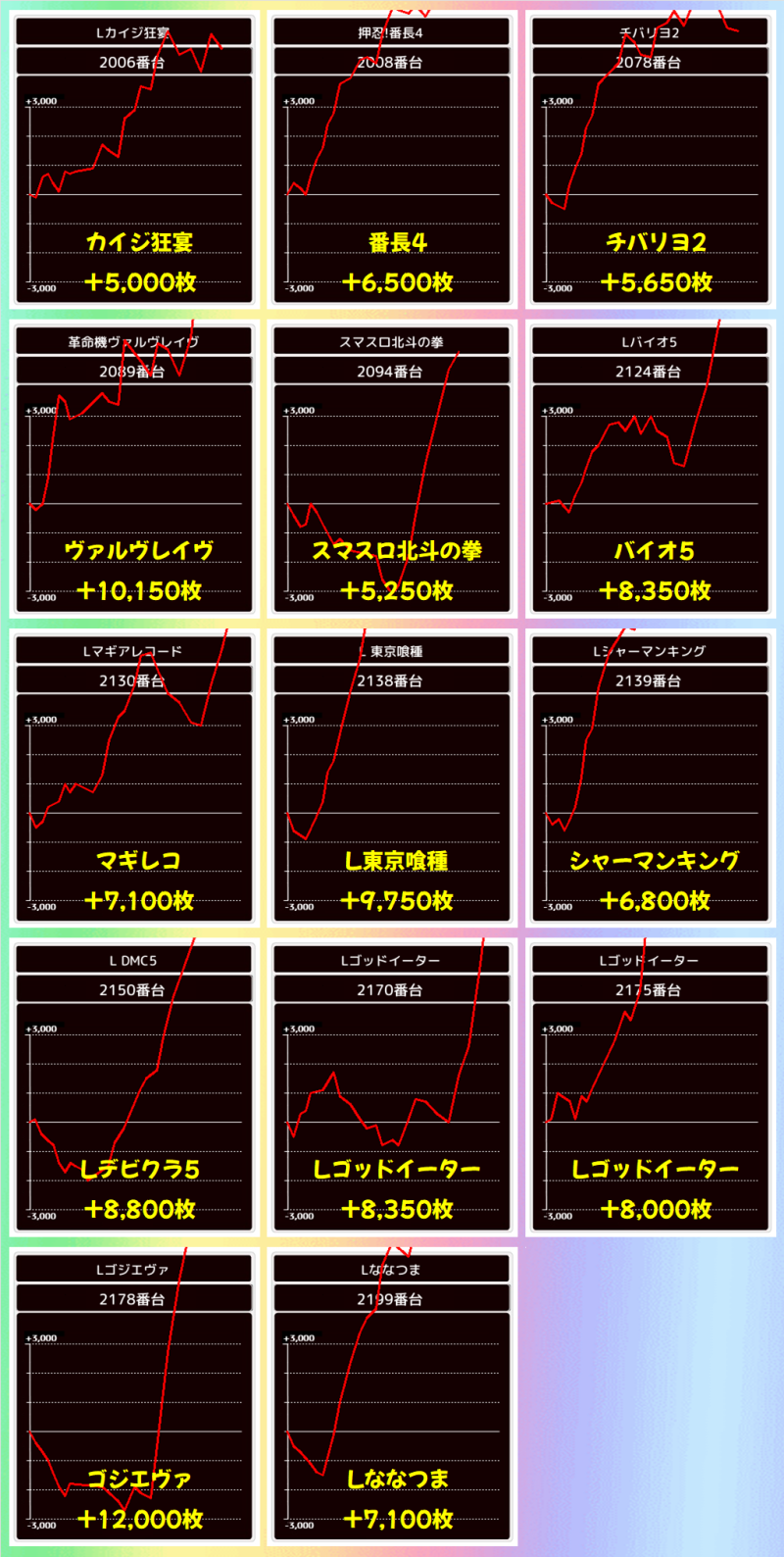 仕掛け外からも+5000枚超を10台以上確認!上記以外にも+3000枚クラスの台なども数多くあったので、単品のお宝台も複数あったのは間違いないですよ!