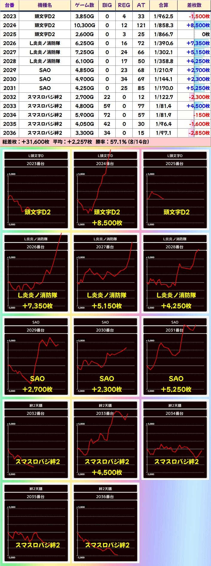 第2土曜は優秀列があるのが特徴で、今回も上記箇所が優秀列と思わしき箇所でした。全台プラスのSAOに8000枚超の頭文字Dと不発台があるなかでしっかりと結果を残した台が数多く確認!